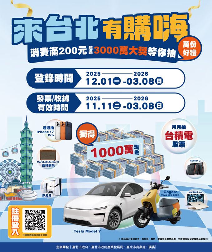 活動簡介: 本市商業處為配合中央普發現金政策,辦理「來台北有購嗨 消費歡樂抽」消費登錄抽獎活動,活動自114年12月1日開始登錄,可登錄114年11月至115年3月的發票,並規劃推出週週抽iPhone 17 Pro、月月抽台積電、市民專屬加碼抽 及總抽大獎1,000萬現金等 活動,總計抽出超過萬名得獎者,總獎值超過新臺幣3,000萬元,消費200元即可獲得1次抽獎機會,單筆最高100次抽獎機會,友好特店消費抽獎機會再翻倍,消費越多中獎機會越高!